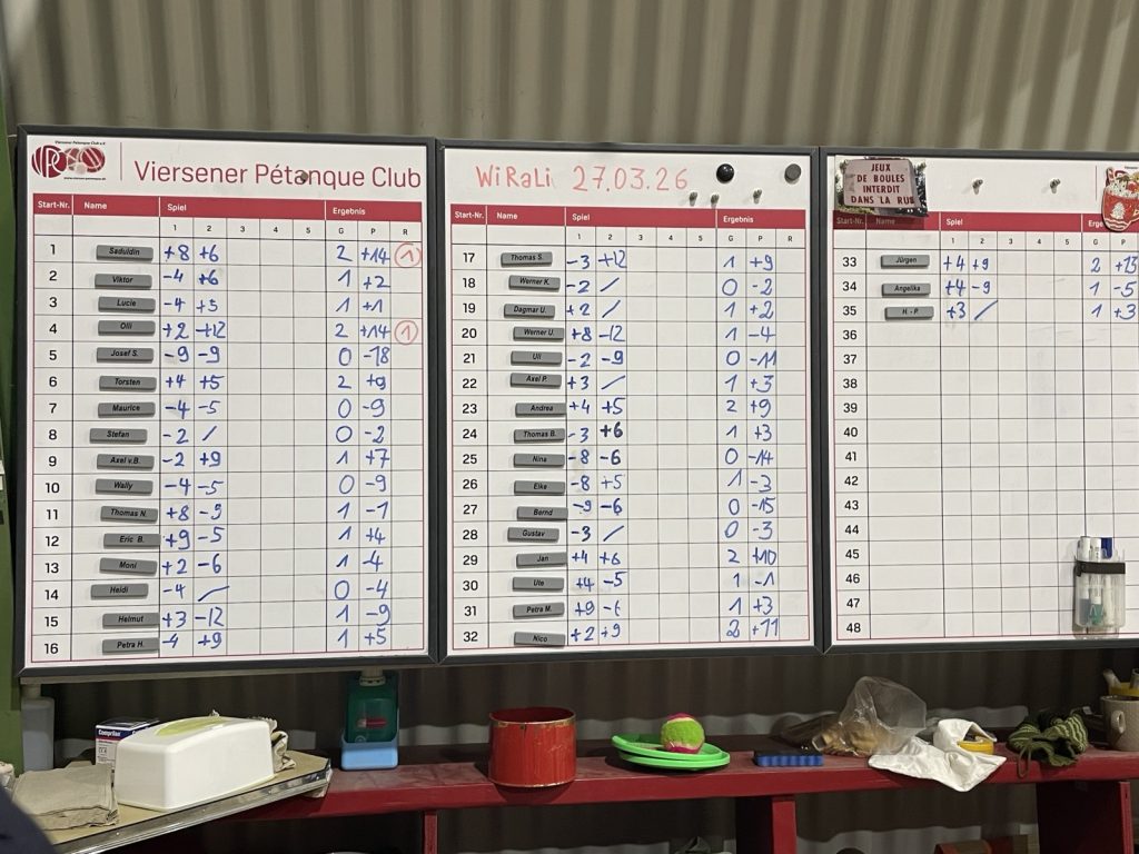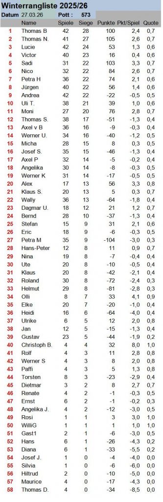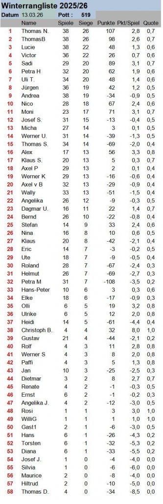 die Winterrangliste 2025/2026 beginnt am 24.Oktober 2025 und wird nach dem gleichen Modus durchgeführt wie die Sommerliga mit aller Vorraussichtl. 24 Spieltagen. Jeden Freitag werden 2 Runden Doublette zu je einer Stunde ohne weitere Aufnahme gespielt. Beginn um 17:30 mit Anmeldung bis 17:20 – Einsatz: 1 € pro Spiel