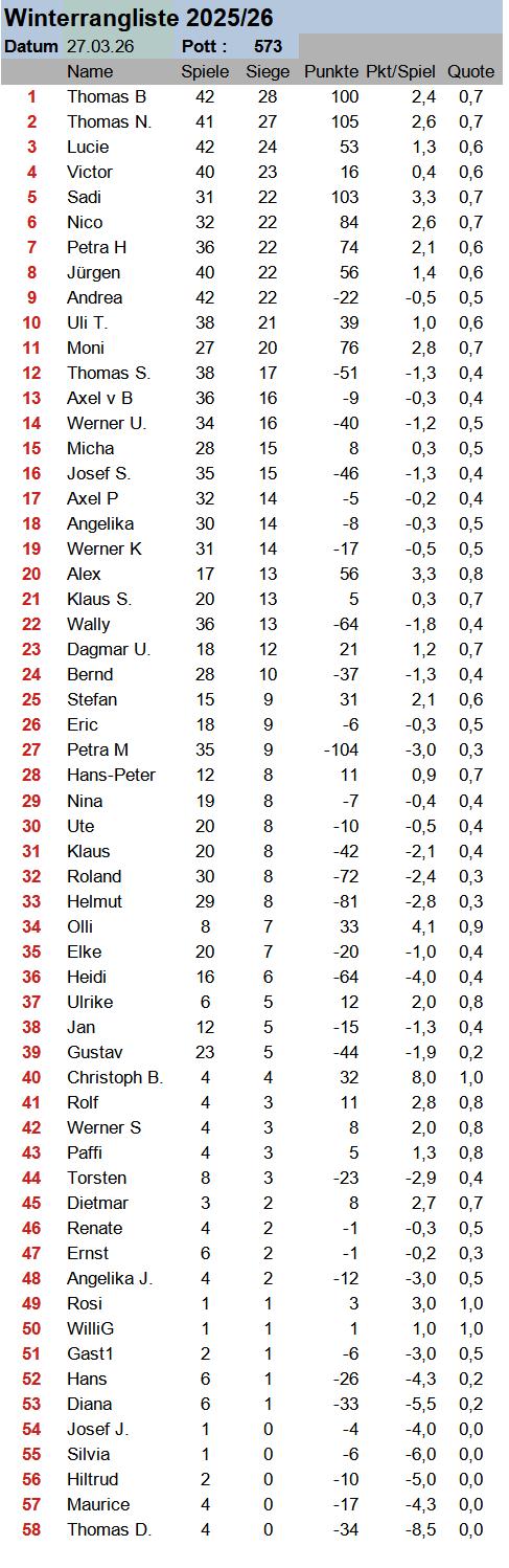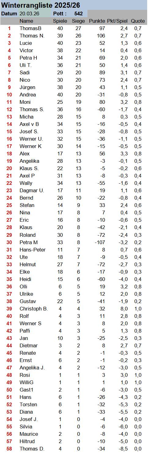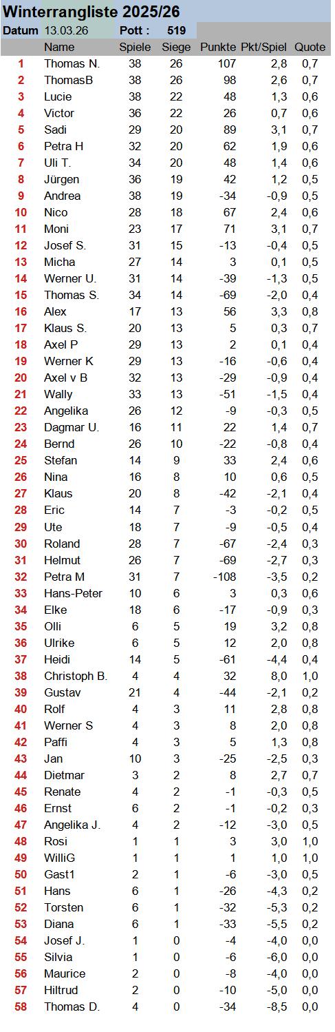 die Winterrangliste 2025/2026 beginnt am 24.Oktober 2025 und wird nach dem gleichen Modus durchgeführt wie die Sommerliga mit aller Vorraussichtl. 24 Spieltagen. Jeden Freitag werden 2 Runden Doublette zu je einer Stunde ohne weitere Aufnahme gespielt. Beginn um 17:30 mit Anmeldung bis 17:20 – Einsatz: 1 € pro Spiel